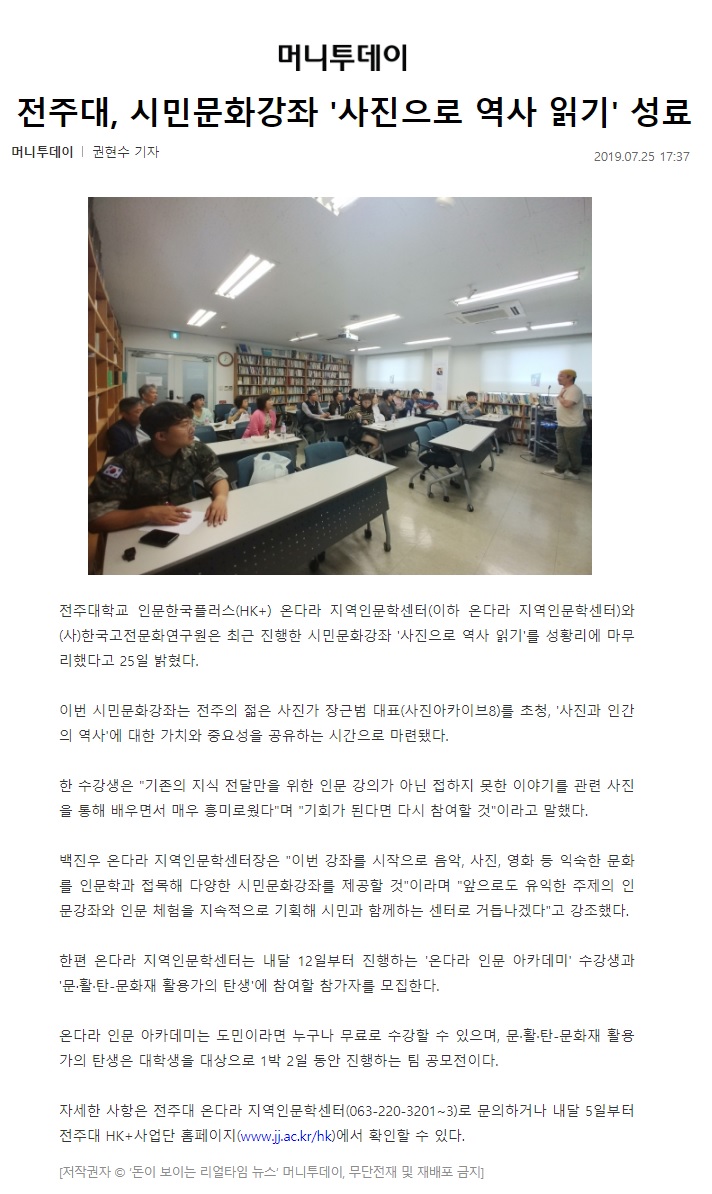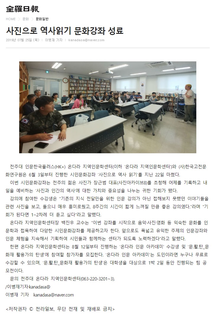 | 171 | 기타 | 사진으로 역사읽기 문화강좌 성료 | 온다라 지역인문학센터 | 19-08-11 | 218 |