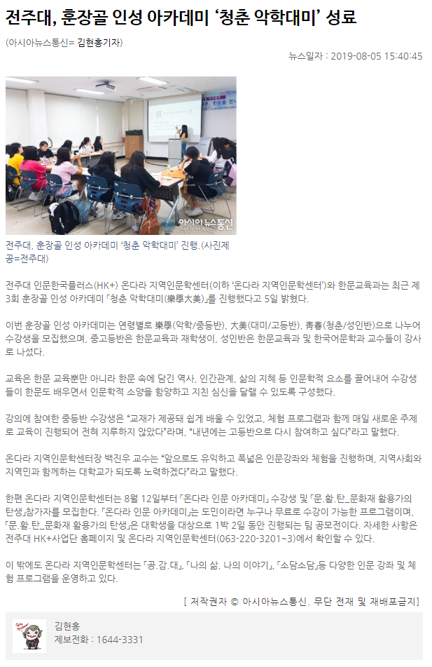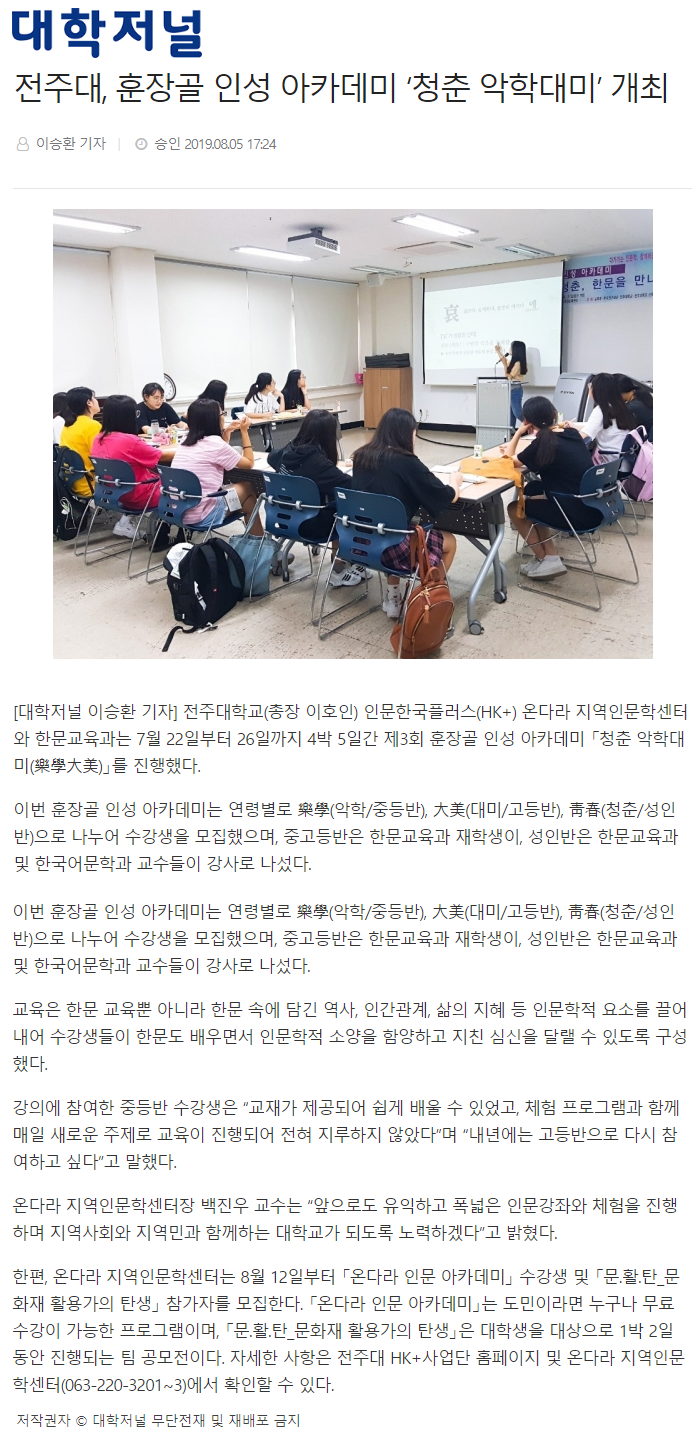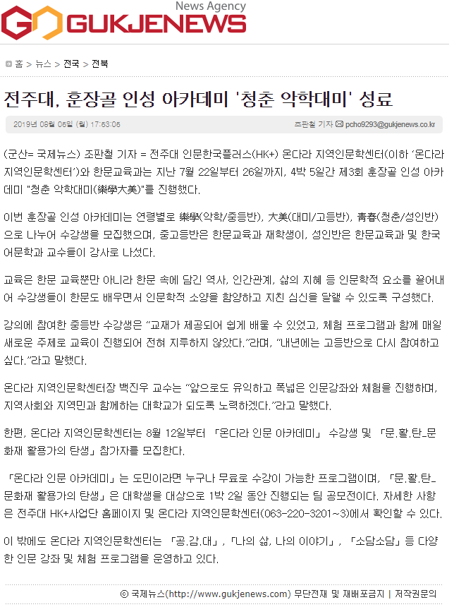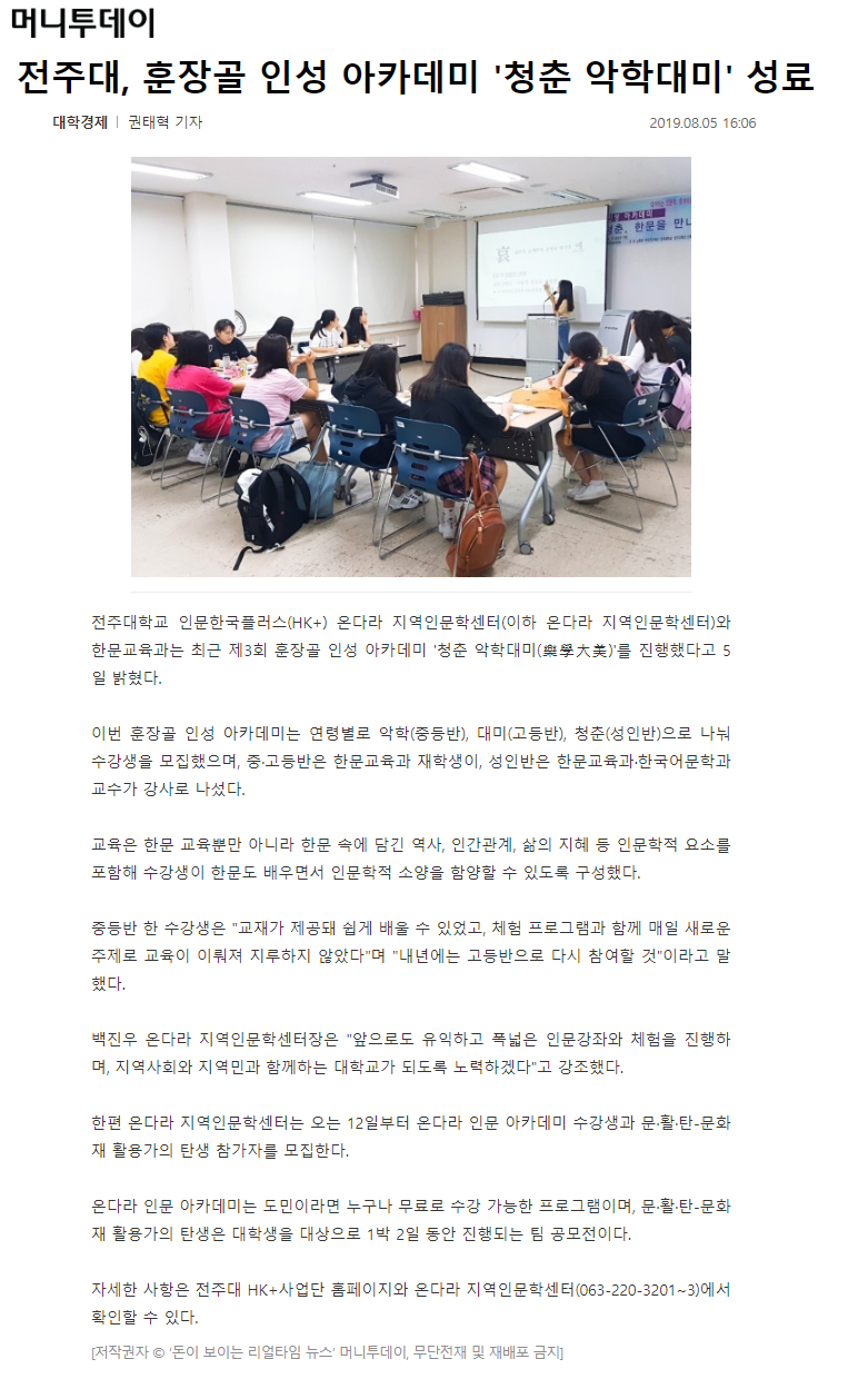 | 174 | 기타 | 전주대, 훈장골 인성 아카데미 '청춘 악학대미' 성료 | 온다라 지역인문학센터 | 19-08-20 | 246 |