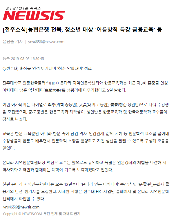| 175 | 기타 | [전주소식]농협은행 전북, 청소년 대상 '여름방학 특강 금융교육' 등 | 온다라 지역인문학센터 | 19-08-20 | 242 |