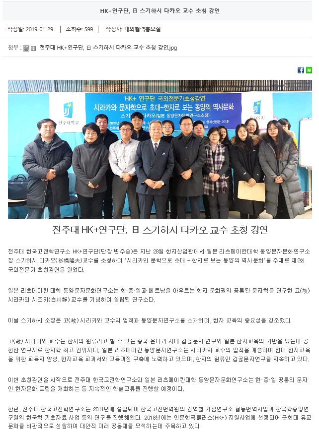 | 122 | 기타 | 전주대 HK+연구단, 日 스기하시 다카오 교수 초청 강연 | 온다라 지역인문학센터 | 19-08-10 | 224 |