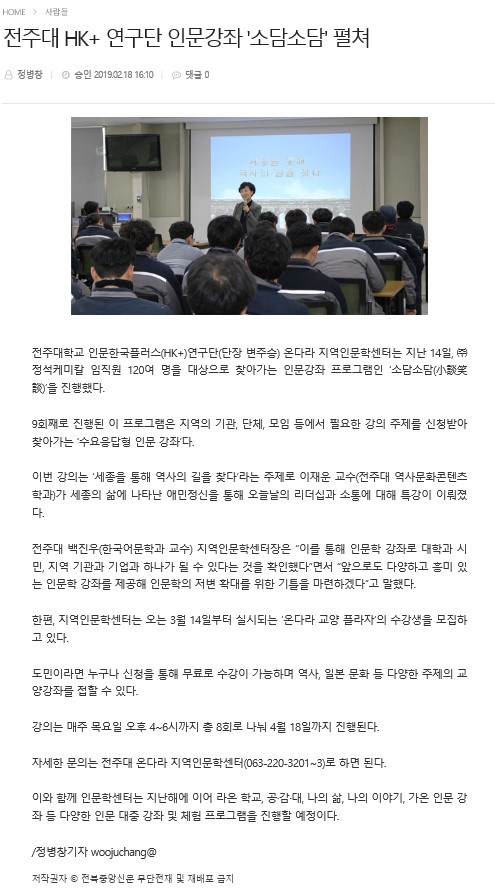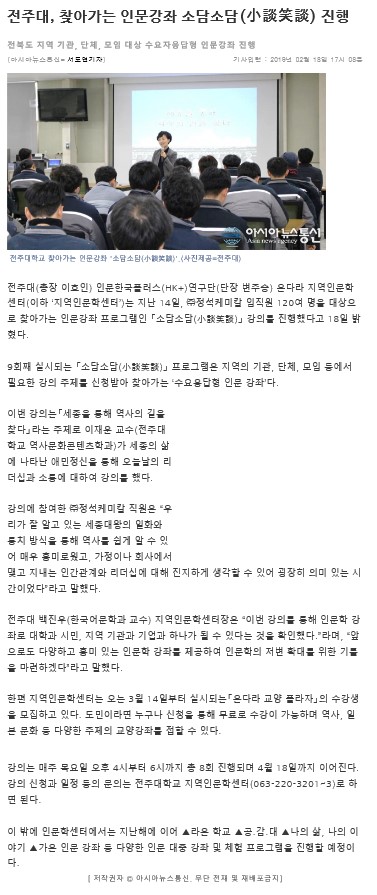 전주대, 찾아가는 인문강좌 소담소담(小談笑談) 진행