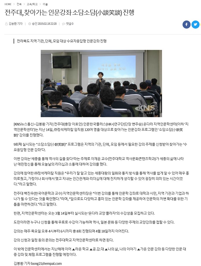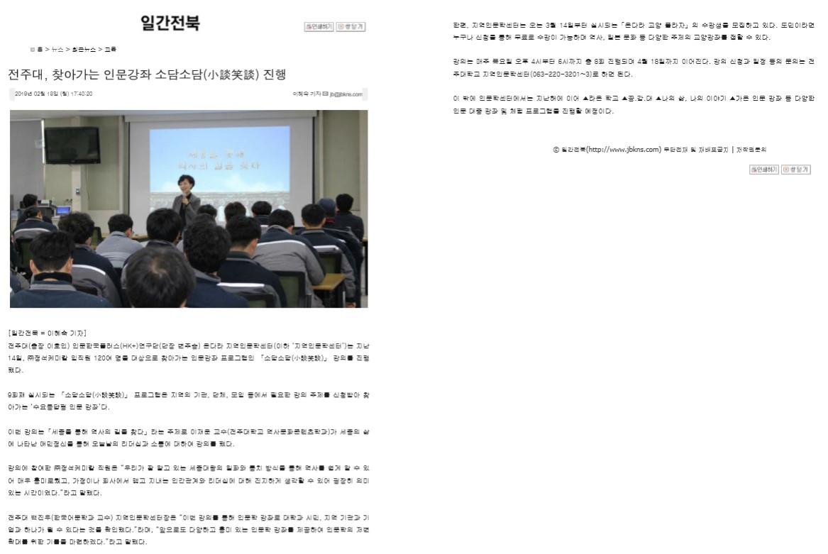 | 126 | 기타 | 전주대, 찾아가는 인문강좌 소담소담(小談笑談) 진행 | 온다라 지역인문학센터 | 19-08-11 | 216 |
