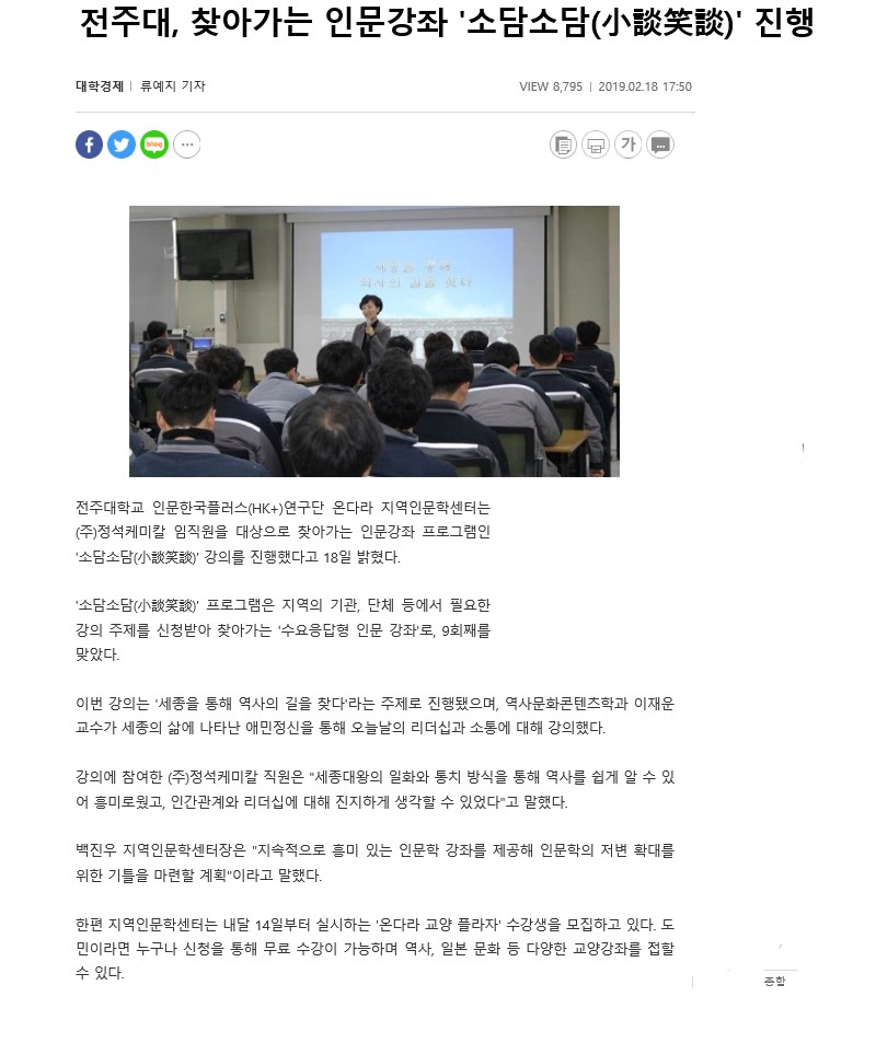 | 123 | 기타 | 전주대 인문강좌 '소담소담(小談笑談)' 정석 케미칼서 | 온다라 지역인문학센터 | 19-08-11 | 221 |