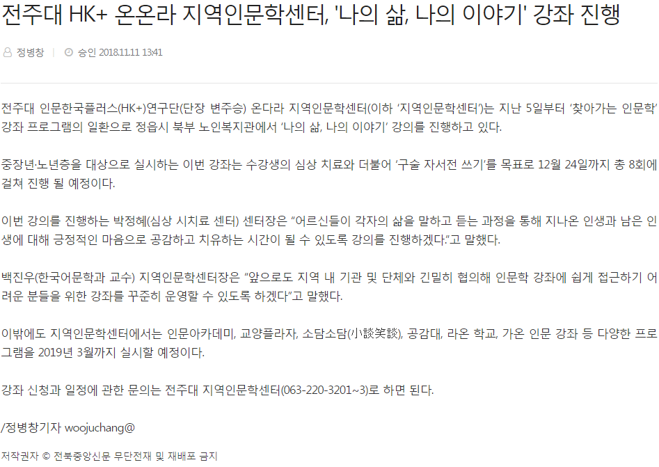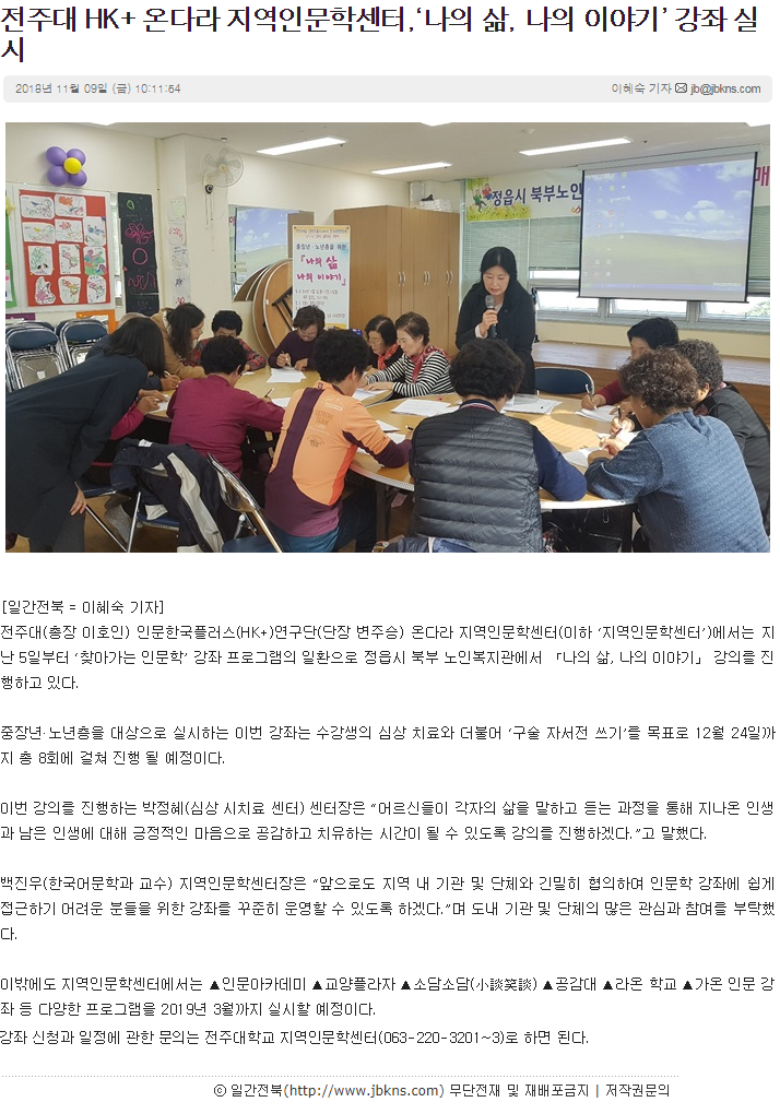 | 99 | 기타 | 전주대 HK+ 온다라 지역인문학센터, ‘나의 삶, 나의 이야기’ 강좌 실시 | 온다라 지역인문학센터 | 19-08-10 | 232 |