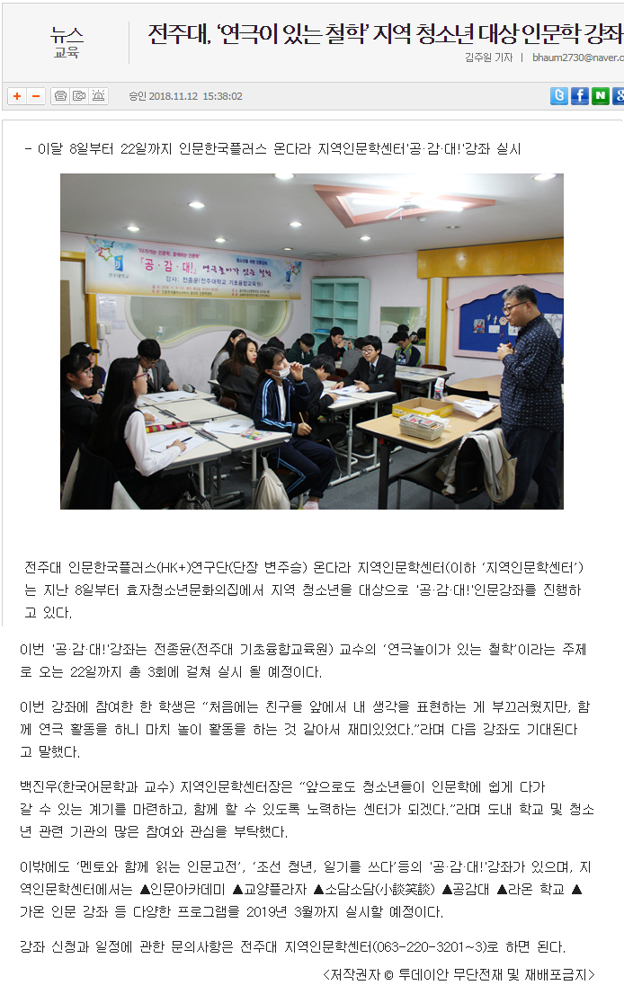 | 104 | 기타 | 전주대, ‘연극이 있는 철학’ 지역 청소년 대상 인문학 강좌 | 온다라 지역인문학센터 | 19-08-10 | 228 |