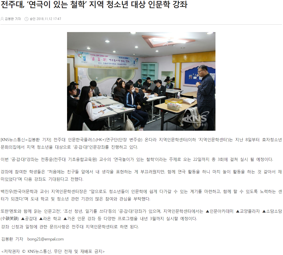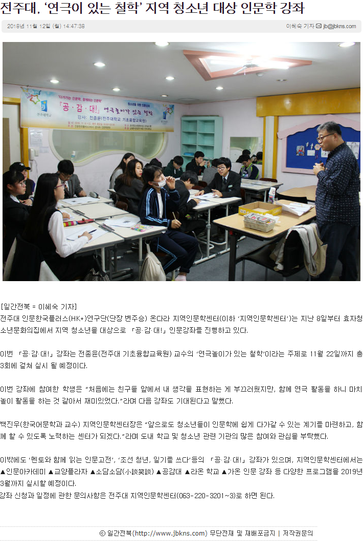 | 106 | 기타 | 전주대, ‘연극이 있는 철학’ 지역 청소년 대상 인문학 강좌 | 온다라 지역인문학센터 | 19-08-10 | 222 |