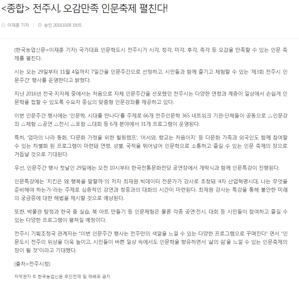 | 59 | 기타 | <종합>전주시, 오감만족 인문축제 펼친다! | 온다라 지역인문학센터 | 19-08-08 | 216 |