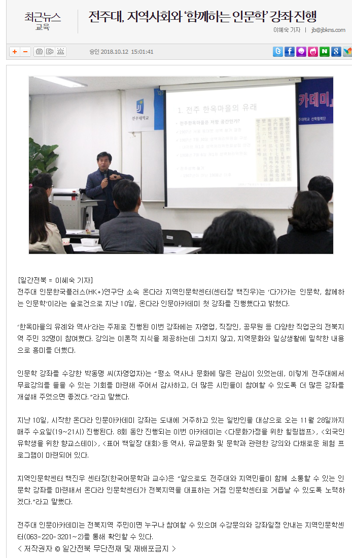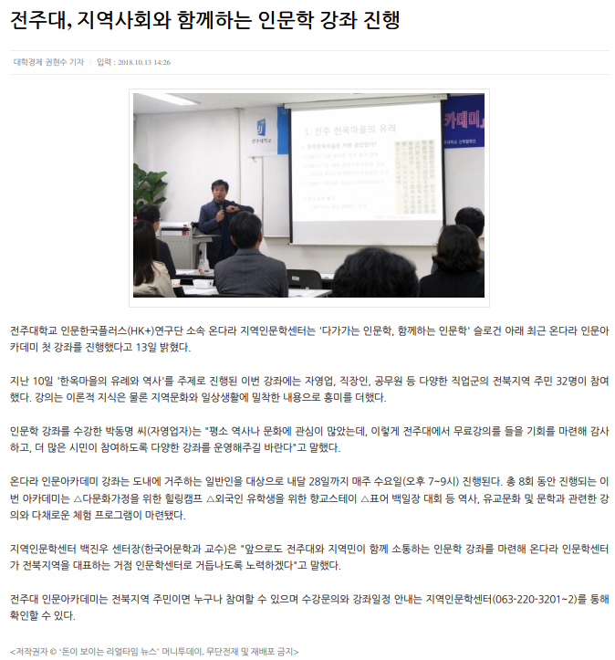 전주대 지역인문학센터, 온다라 인문아카데미 강좌 진행