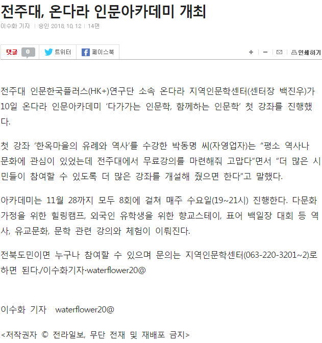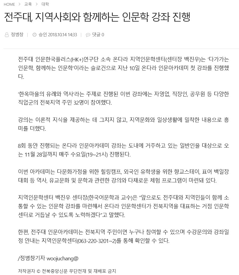 | 62 | 기타 | 전주대 지역인문학센터, 온다라 인문아카데미 강좌 진행 | 온다라 지역인문학센터 | 19-08-08 | 212 |
