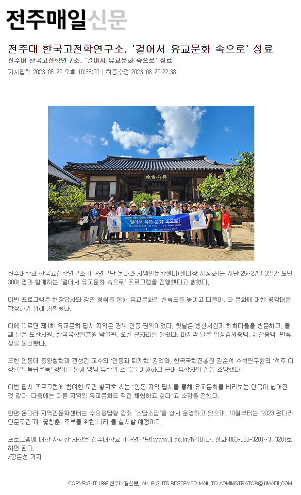 | 687 | 기타 | 전주대 한국고전학연구소, '걸어서 유교문화 속으로!' 성료 | 온다라 지역인문학센터 | 23-10-04 | 233 |