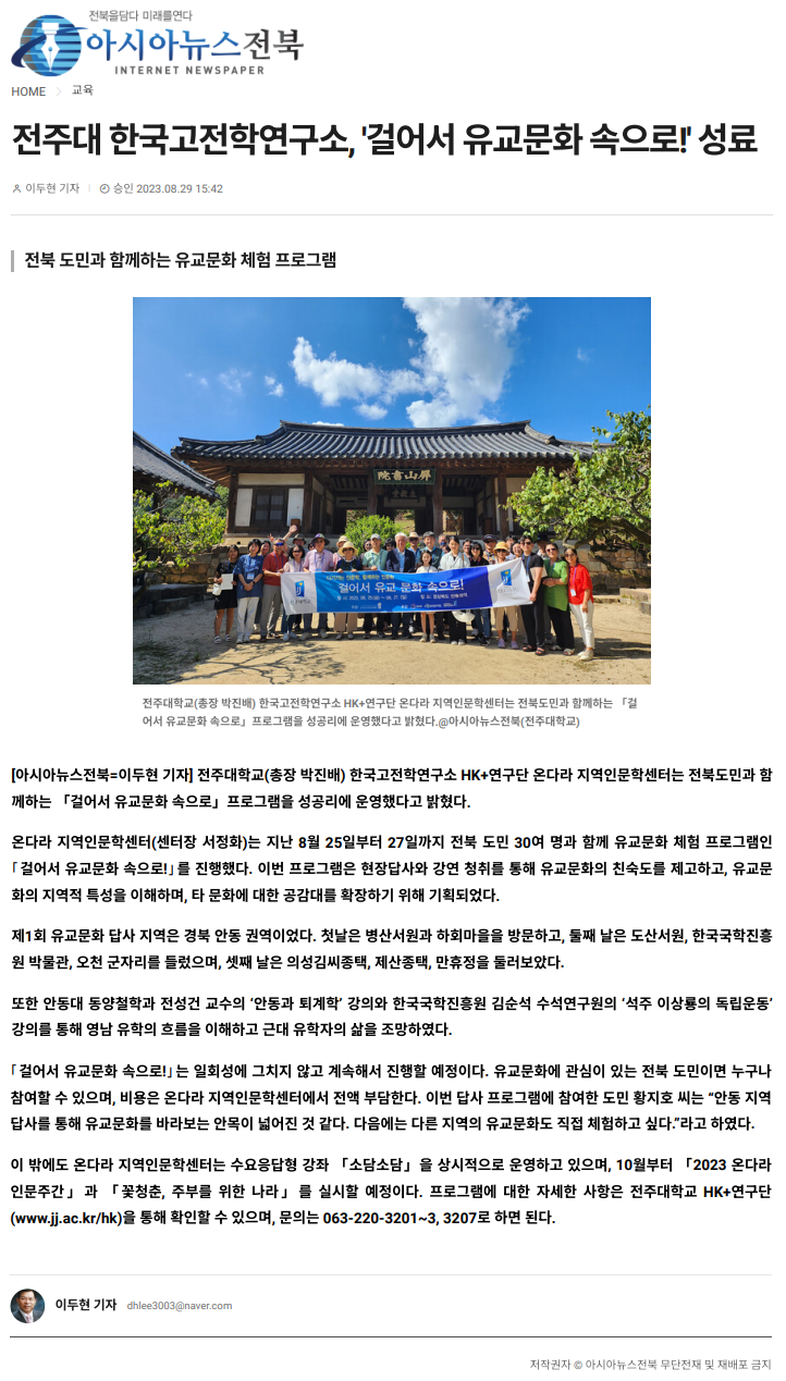 전주대 한국고전학연구소, '걸어서 유교문화 속으로!' 성료