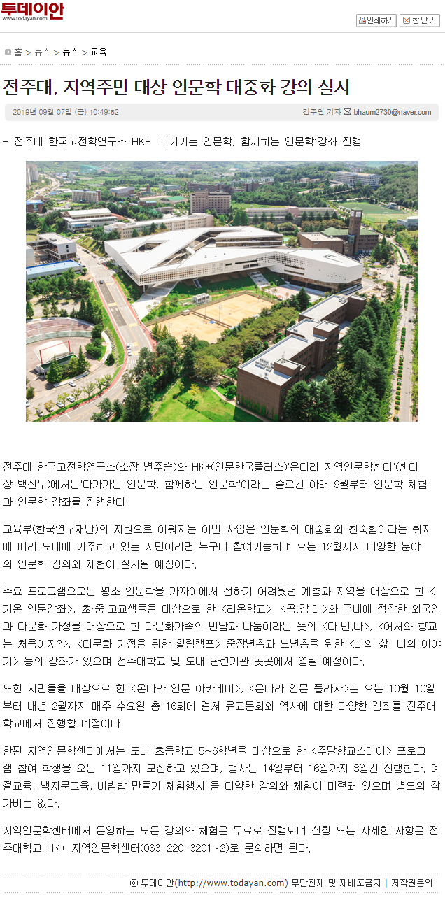 | 49 | 기타 | 전주대, 교육부 지원 지역주민 대상 '인문학 대중화' 강의 마련 | 온다라 지역인문학센터 | 19-08-05 | 277 |