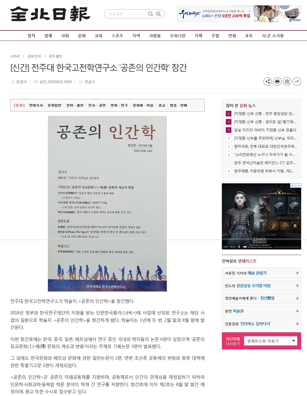 | 24 | 기타 | 전주대 한국고전학연구소 HK+연구단에서 창간한 학술지 <공존의 인간학> | 한국고전학연구소 | 19-03-25 | 866 |