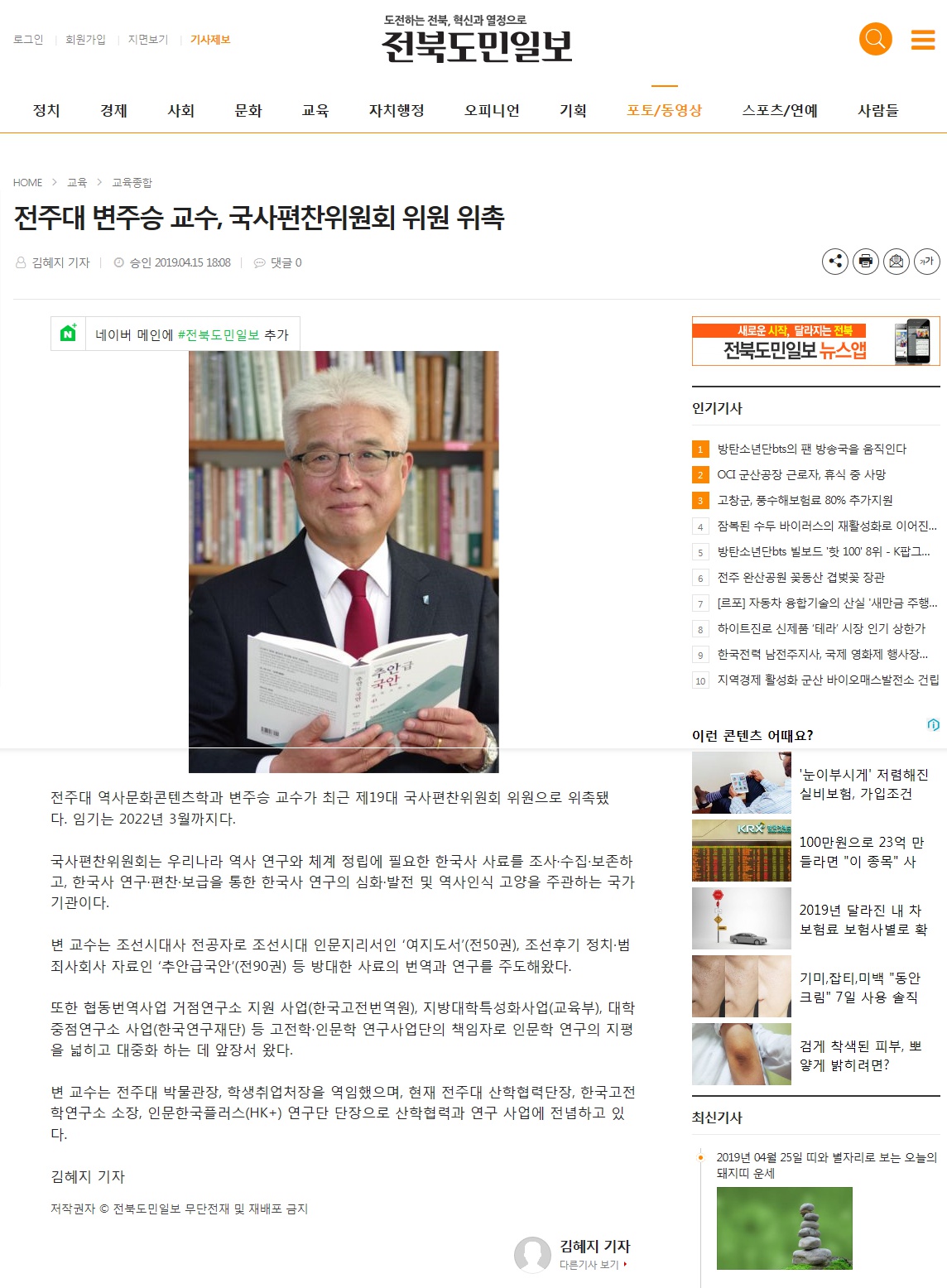 전주대학교 역사문화콘텐츠학과 변주승 교수, 국사편찬위원회 위원 위촉