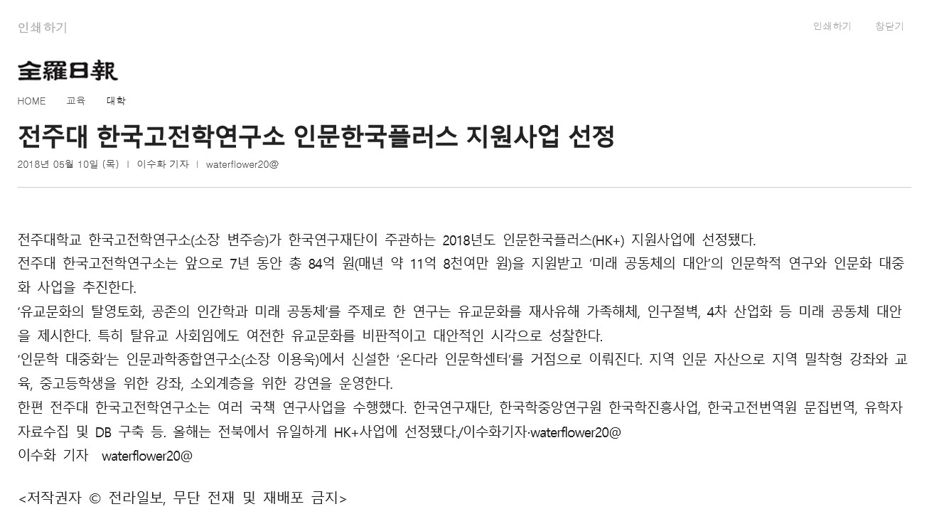 전주대 한국고전학연구소 인문한국플러스 지원사업 선정